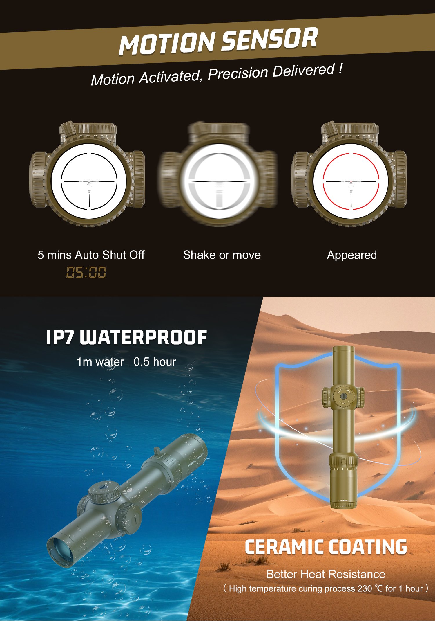 Kompaktowy wymiar lunety 250mm i waga 505g., 34mm tubus, szeroki zakres widzenia z obiektywem 28mm,